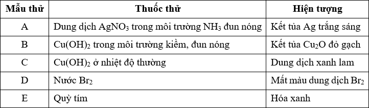 Kết quả thí nghiệm của các hợp chất hữu cơ A, B, C, D, E như sau:
