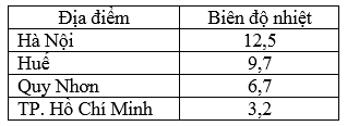 Theo bảng số liệu, nhận xét nào sau đây đúng khi so sánh biên độ nhiệt độ năm của các địa điểm trên?
