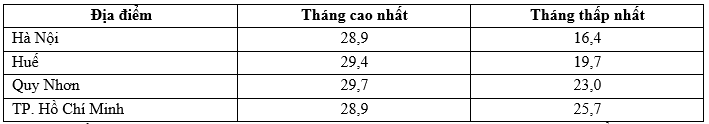 Cho bảng số liệu: NHIỆT ĐỘ TRUNG BÌNH THÁNG CAO NHẤT VÀ THẤP NHẤT CỦA MỘT SỐ ĐỊA ĐIỂM