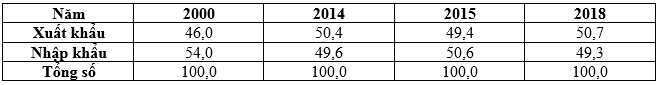 Theo bảng số liệu, để thể hiện sự chuyển dịch cơ cấu giá trị xuất khẩu và nhập khẩu của nước ta giai đoạn 2000 - 2018 dạng biểu đồ nào sau đây là thích hợp nhất?