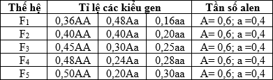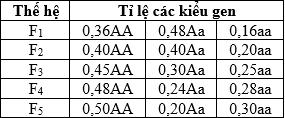 Ở một quần thể, xét cặp alen Aa nằm trên NST thường, trong đó alen A trội hoàn toàn so với alen a. Theo dõi tỉ lệ kiểu gen của quần thể qua 5 thế hệ liên tiếp, kết quả thu được bảng sau: