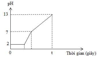 Điện phân 400 ml dung dịch X gồm KCl, HCl và CuCl2 0,02M (điện cực trơ, màng ngăn xốp) với cường độ dòng điện bằng I = 1,93A. Biết thể tích dung dịch không thay đổi trong quá trình điện phân, bỏ qua sự thủy phân của ion Cu2+. Cho đồ thị biểu diễn mối quan hệ giữa thời gian điện phân và pH của dung dịch như hình vẽ: