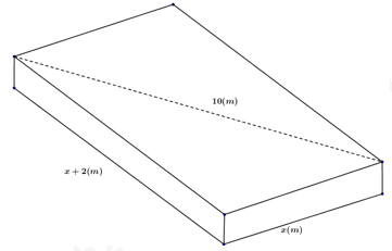 Chiều dài hơn chiều rộng \(2m\): \(x + 2{\kern 1pt} {\kern 1pt} {\kern 1pt} {\kern 1pt} {\kern 1pt} \left( m \right)\)