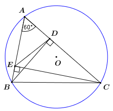 Cho tam giác nhọn \(ABC\)có\(\angle A = {60^0}\), nội tiếp đường tròn tâm\(O\). Kẻ hai đường cao \(BD\)và \(CE\) (\(D \in AC,E \in AB\)).