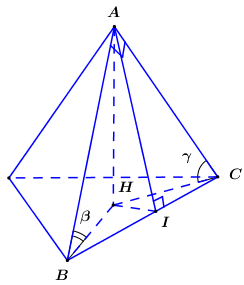 Cho tam giác \(ABC\) vuông tại \(A\). Mặt phẳng \(\left( P \right)\) chứa \(BC\) và hợp với mặt phẳng \(\left( {ABC} \right)\) góc \(\alpha \,\,\left( {{0^0} < \alpha < {{90}^0}} \right)\). Gọi \(\beta ,\,\,\gamma \) lần lượt là góc hợp bởi hai đường thẳng \(AB,\,\,AC\) và