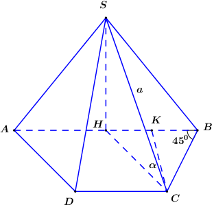 Cho hình chóp \(S.ABCD\) có đáy là hình thang, \(AB//CD,\,\,AB = 2DC,\,\,\)\(\angle ABC = {45^0}\). Hình chiếu vuông góc của đỉnh \(S\) trên mặt phẳng \(\left( {ABCD} \right)\) là trung điểm \(H\) của cạnh \(AB\) và \(SC \bot BC,\,\,SC = a\). Gọi góc giữa hai mặt phẳng \(\left( {SBC} \right)\) và \(\left( {ABCD} \right)\) là \(\alpha \). Khi \(\alpha \) thay đổi, tìm \(\cos \alpha \) để thể tích khối chóp \(S.ABCD\) có giá trị lớn nhất.