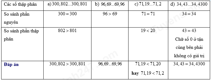 Điền dấu thích hợp vào chỗ trống: a) \(300,802...300,801\) b) \(96,69...69,96\) c) \(71,19...71,2\) d)