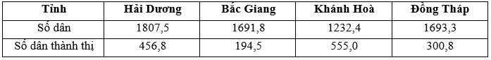 Cho bảng số liệu SỐ DÂN VÀ SỐ DÂN THÀNH THỊ CỦA MỘT SỐ TỈNH NĂM 2018 (Đơn vị: Nghìn