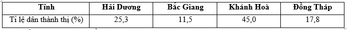 Nhận xét nào sau đây đúng khi so sánh tỉ lệ dân thành thị trong dân số của các tỉnh năm 2018?