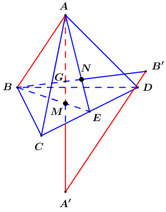 - Gọi \(M,\,\,N\) lần lượt là trong tâm tam giác \(BCD,\,\,ACD\), gọi \(G = AM \cap BN\). Tính \(\dfrac{{GA'}}{{GA}} = \dfrac{{A'B'}}{{AB}}\).
