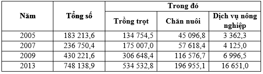GIÁ TRỊ SẢN XUẤT NÔNG NGHIỆP PHÂN THEO NGÀNH CỦA NƯỚC TA GIAI ĐOẠN 2005 – 2013 (Đơn vị: Tỷ đồng)