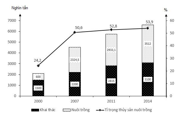 Cho biểu đồ SẢN LƯỢNG THỦY SẢN VÀ TỈ TRỌNG SẢN LƯỢNG THỦY SẢN NUÔI TRỒNG CỦA NƯỚC