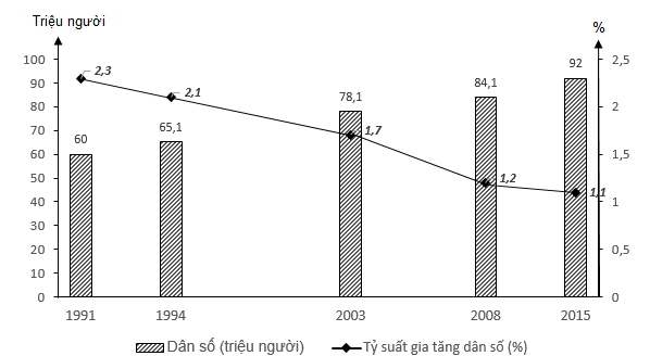 Cho biểu đồ về dân số nước ta giai đoạn 1985 - 2013: (Niên giám thống kê Việt Nam 2014, NXB