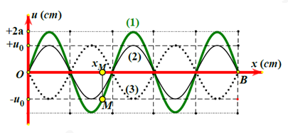 Sóng dừng hình thành trên một sợi dây đàn hồi OB, với đầu phản xạ B cố định và tốc độ lan truyền sóng trên dây là \(v = 400cm/s\). Hình ảnh sóng dừng như hình vẽ. Sóng tới B có biên độ \(a = 2cm\), thời điểm ban đầu hình ảnh sợi dây là đường (1), sau đó các khoảng thời gian là 0,005s và 0,015s thì hình ảnh sợi dây lần lượt là đường (2) và đường (3). Biết \({x_M}\) là vị trí phần tử M của sợi dây lúc sợi dây duỗi thẳng. Khoảng cách xa nhất giữa M tới phần tử sợi dây có cùng biên độ với M là