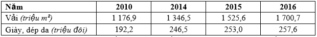 Cho bảng số liệu:MỘT SỐ SẢN PHẨM CÔNG NGHIỆP CỦA NƯỚC TA, GIAI ĐOẠN 2010 – 2016(Nguồn: