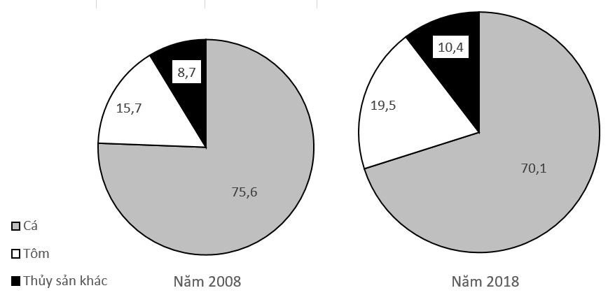Theo biểu đồ, nhận xét nào sau đây đúng về sự thay đổi tỉ trọng trong cơ cấu sản lượng thủy sản nuôi trồng của nước ta năm 2018 so với năm 2008?