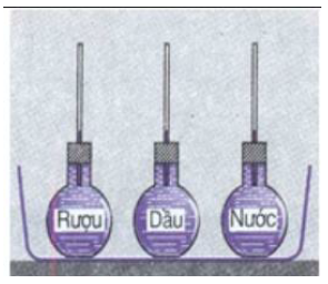 Có ba bình cầu giống nhau đựng ba loại chất lỏng là Rượu, Dầu và Nước như hình vẽ, ban đầu mực chất lỏng trong các ống thủy tinh là như nhau. Cùng đặt cả ba bình vào chậu nước nóng, mực chất lỏng trong các ống thủy tinh dâng lên như thế nào?