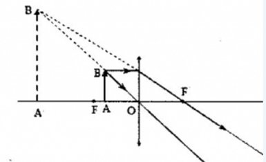 Vật sáng AB đặt vuông góc với trục chính của một thấu kính hội tụ và cách thấu kính 10 cm. Nhìn qua thấu kính thấy một ảnh cùng chiều và cao gấp 3 lần vật. Vẽ hình và xác định tiêu cự của thấu kính.