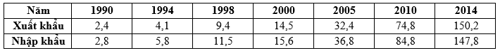 Cho bảng số liệu:GIÁ TRỊ XUẤT KHẨU, NHẬP KHẨU CỦA NƯỚC TA GIAI ĐOẠN 1990 - 2014(Đơn vị: ti