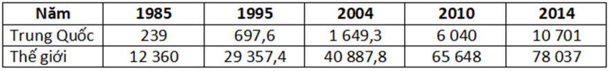 Cho bảng số liệu:Tỉ trọng GDP của Trung Quốc so với thế giới qua các năm lần lượt