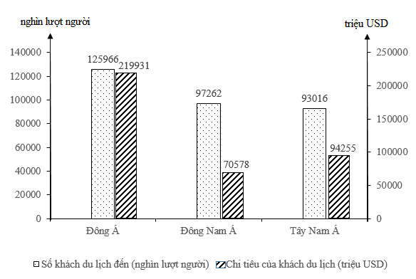 a) Vẽ biểu đồ thể hiện số khách du lịch đến và chi tiêu của khách du lịch ở một số khu vực châu Á năm 2014.