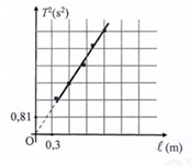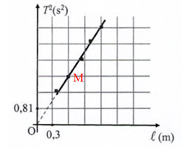Trong bài thực hành đo gia tốc trọng trường g bằng con lắc đơn, một nhóm học sinh tiến hành đo, xử lí số liệu và vẽ được đồ thị biểu diễn sự phụ thuộc của bình phương chu kì dao động điều hòa (T2) theo chiều dài l của con lắc như hình bên. Lấy π = 3,14. Giá trị trung bình của g đo được trong thí nghiệm này là