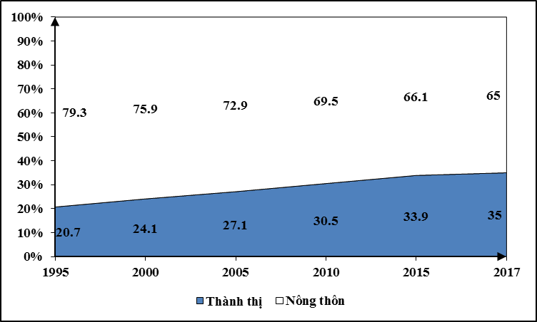Biểu đồ trên thể hiện nội dung nào về dân số theo thành thị và nông thôn nước ta từ năm 1995 đến năm 2017?