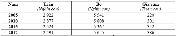 Cho bảng số liệu sau:Số lượng đàn gia súc và gia cầm của nước ta từ năm 2000 đến năm 2017.