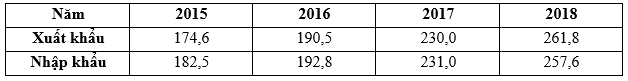 Cho bảng số liệu:GIÁ TRỊ XUẤT NHẬP KHẨU HÀNG HÓA CỦA VIỆT NAM GIAI ĐOẠN 2015 – 2018(Đơn