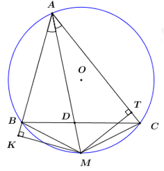 Cho ∆ABC có 3 góc nhọn nội tiếp đường tròn (O). Tia phân giác góc \(\angle BAC\) cắt cạnh BC tại D và cắt đường tròn (O) tại M. Gọi K là hình chiếu của M trên AB. I là hình chiếu của M trên AC. Chứng minh rằng