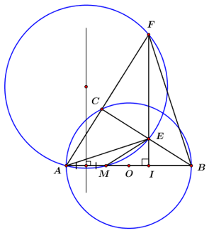 Cho đường tròn \(\left( O \right)\), đường kính \(AB\). Trên \(\left( O \right)\) lấy điểm \(C\) sao cho \(AC < BC\). Trên đoạn thẳng \(OB\) lấy điểm \(I\) cố định (\(I\) khác \(O,B\)). Đường thẳng qua \(I\) vuông góc với \(AB\) cắt \(BC\) tại \(E\), cắt \(AC\) tại \(F\)