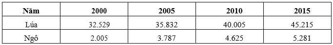 Cho bảng số liệu: Sản lượng lúa và ngô của nước ta giai đoạn 2000-2015 (Đơn vị: nghìn tấn)
