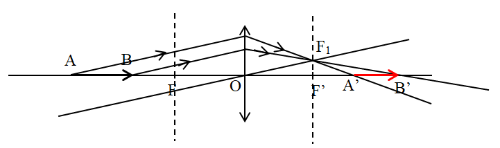 + Từ B vẽ tia tới song song với trục phụ, tia ló đi qua F1. Giao điểm của tia ló và trục chính là ảnh B’