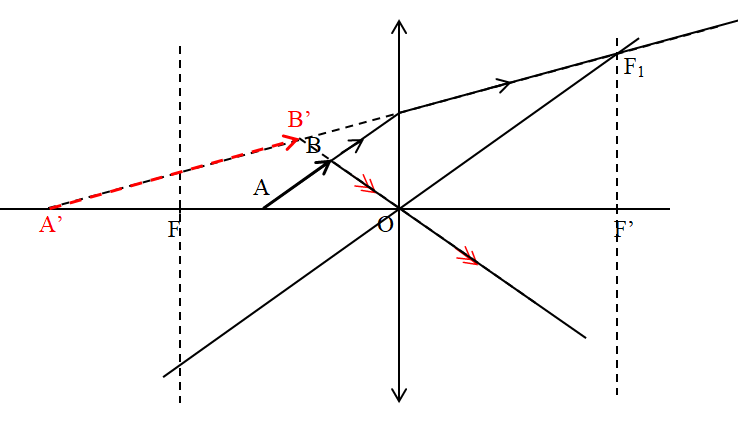 + Tia sáng đi từ AB đến thấu kính cho tia ló đi qua F1, ảnh A’B’ nằm trên đường kéo dài của tia ló