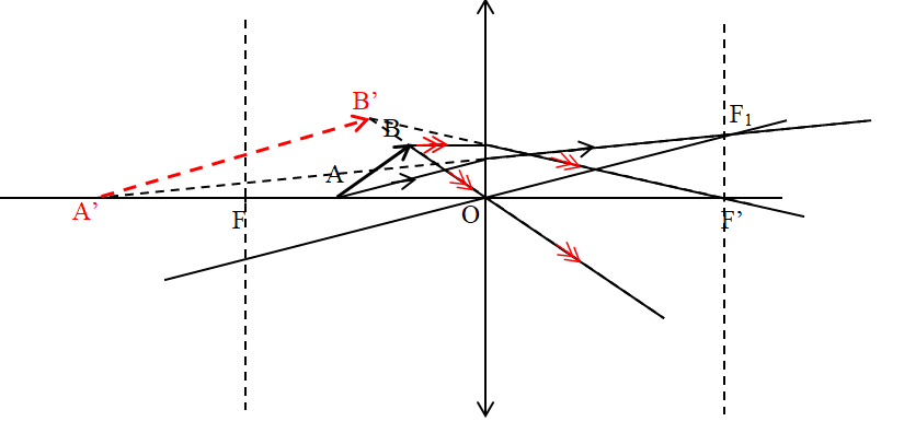 + Kẻ một trục phụ song song với vật, cắt tiêu diện tại tiêu điểm phụ F1