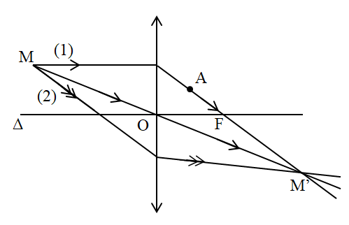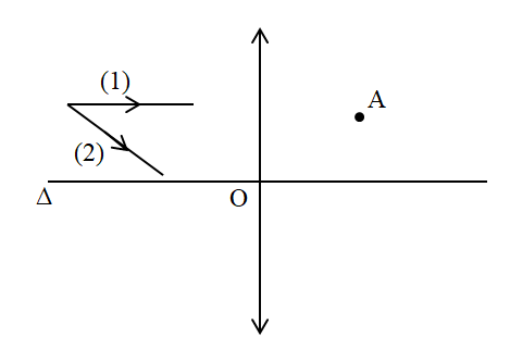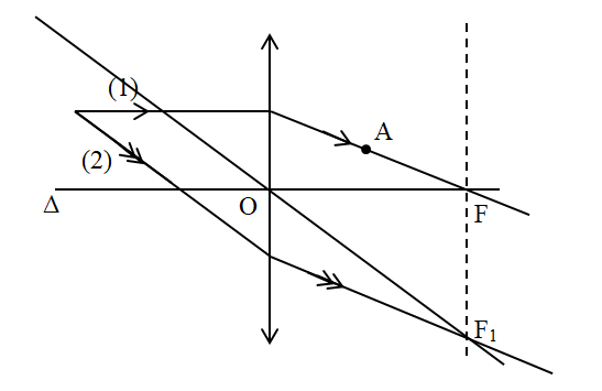 Cho thấu kính hội tụ, các tia sáng tới như hình vẽ. Biết tia (1) song song với trục chính, tia (2) có phương không đi qua quang tâm O và A là một điểm cho trước. Tia (1) sau khi khúc xạ qua thấu kính sẽ đi qua A. Hãy vẽ và trình bày cách vẽ đường truyền tia sáng (2) qua thấu kính.