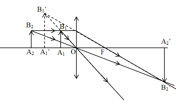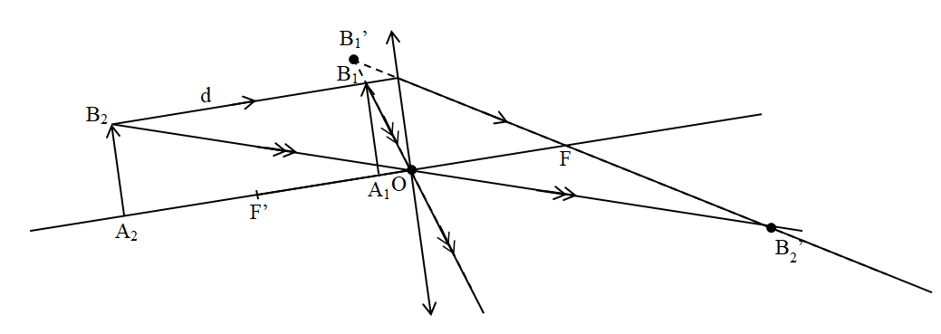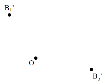 Người ta tìm thấy trong ghi chép của nhà Vậ Lí Snell một sơ đồ quang học. Khi đọc mô tả kèm theo thì biết trên sơ đồ đó vẽ hai ảnh A1’B1’ và A2’B2’ của hai vật A1B1 và A2B2 qua thấu kính. Hai vật này là hai đoạn thẳng có cùng độ cao, đặt song song với nhau, cùng vuông góc với trục chính và ở trước thấu kính (A1 và A2 nằm trên trục chính của thấu kính, B1 và B2 nằm về cùng một phía so với trục chính). Độ cao hai ảnh tương ứng A1’B1’ và A2’B2’ cũng bằng nhau. Do lâu ngày nên các nét vẽ bị nhòe và trên sơ đồ chỉ còn rõ ba điểm quang tâm O, các ảnh B1’ và B2’ của B1 và B2 tương ứng (hình vẽ). Bằng cách vẽ hãy xác định vị trí của trục chính, các tiêu điểm, các vật A1B1 và A2B2. Nêu rõ cách vẽ.