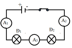 Trong mạch điện có sơ đồ như hình vẽ bên, các ampe kế \({A_1},{A_2}\) và \({A_3}\) có số