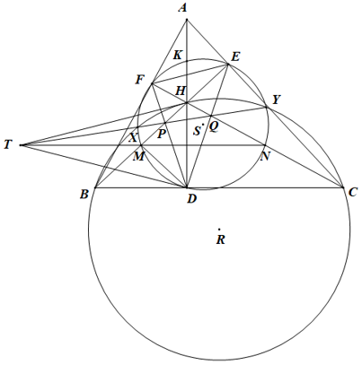 3) Gọi \(P\) là giao điểm của hai đường thẳng \(BH\) và \(DF,\)\(Q\) là giao điểm của hai đường thẳng \(CH\) và \(DE.\) Chứng minh ba điểm \(T,P,Q\)là ba điểm thẳng hàng.