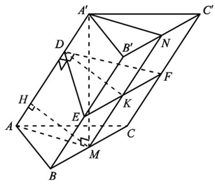 Cho hình lăng trụ \(ABC.A'B'C'\) có đáy là tam giác đều. Hình chiếu vuông góc của \(A'\) trên mặt phẳng \(\left( {ABC} \right)\) là trung điểm của \(BC\). Mặt phẳng \(\left( P \right)\) vuông góc với các cạnh bên và cắt các cạnh bên của hình lăng trụ lần lượt tại \(D,\,\,E,\,\,F\). Biết mặt phẳng \(\left( {ABB'A'} \right)\) vuông góc với mặt phẳng \(\left( {ACC'A'} \right)\) và chu vi của tam giác \(DEF\) bằng \(4\), thể tích của khối lăng trụ \(ABC.A'B'C'\) bằng