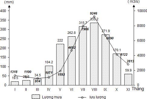 Cho biểu đồ về mưa và lưu lượng dòng chảy tại trạm Sơn Tây của sông Hồng(Nguồn theo Niên