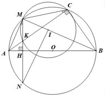 Cho đường tròn \(\left( O \right),\)đường kính \(AB\) cố định. Điểm \(H\) cố định nằm giữa hai điểm \(A\) và \(O\) sao cho \(AH < OH.\) Kẻ dây cung \(MN\) vuông góc với \(AB\) tại \(H\). Gọi \(C\) là điểm tùy ý thuộc cung lớn \(MN\) sao cho \(C\) không trùng với \(M,N\) và \(B.\) Gọi \(K\) là giao điểm của \(AC\) và \(MN.\)