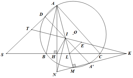 Cho tam giác nhọn \(ABC\left( {AB < AC} \right)\)nội tiếp đường tròn \(\left( O \right)\), có đường cao \(AH.\) Gọi \(I\) là tâm đường tròn nội tiếp của tam giác \(ABC.\) Đường thẳng \(AI\) cắt đường tròn \(\left( O \right)\) tại điểm thứ hai \(M.\) Gọi \(A'\) là điểm đối xứng với \(A\) qua \(O\). Đường thẳng \(MA'\) cắt các đường thẳng \(AH,BC\) theo thứ tự tại \(N\) và \(K.\) Gọi \(L\) là giao điểm của \(MA\) và \(BC.\) Đường thẳng \(A'I\) cắt đường tròn \(\left( O \right)\) tại điểm thứ hai là \(D.\) Hai đường thẳng \(AD\) và \(BC\) cắt nhau tại điểm \(S\)