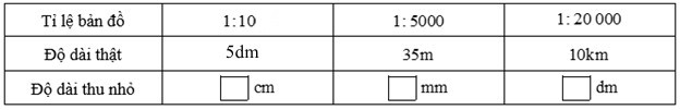 - Để tìm độ dài thu nhỏ ta lấy độ dài thật (đơn vị đo tương ứng với độ dài thu nhỏ) chia cho độ dài thật ứng với \(1\) đơn vị đo trên bản đồ.