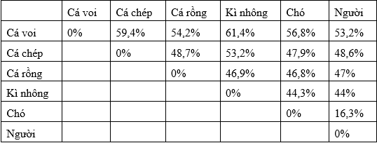 Tỉ lệ % các axit amin sai khác nhau ở chuỗi pôlipeptit anpha trong phân tử hemoglobin của một số loài được mô tả trong bảng sau: