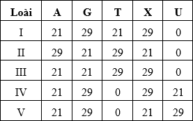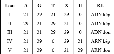 Khi phân tích % nuclêôtit của vật chất di truyền ở các loài sinh vật khác nhau người ta thu được bảng số liệu sau: