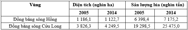 Theo bảng trên, hãy cho biết nhận xét nào sau đây không đúng về diện tích và sản lượng lúa cả năm của Đồng bằng sông Hồng và Đồng bằng sông Cửu Long năm 2005 và năm 2014?