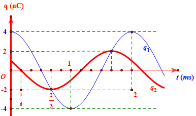 Cho hai mạch dao động lí tưởng \({L_1}{C_1}\) và \({L_2}{C_2}\) với \({L_1} = {L_2}\) và \({C_1} = {C_2} = 1\mu F\), đang hoạt động. Hình bên là đồ thị biểu diễn điện tích của mỗi bản tụ điện theo thời gian. Kể từ thời điểm \(t=0\), thời điểm lần thứ 2018 hiệu điện thế trên hai tụ điện \({C_1}\) và \({C_2}\) chênh lệch nhau 3V là