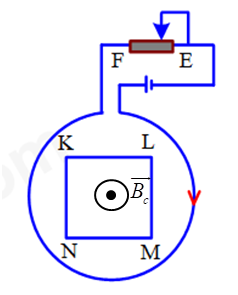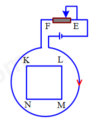 Khung dây dẫn phẳng KLMN và dòng điện tròn cùng nằm trong mặt phẳng hình vẽ. Khi con chạy của biến trở di chuyển đều từ E về F thì trong khung dây xuất hiện dòng điện cảm ứng. Chiều dòng điện cảm ứng trong khung là