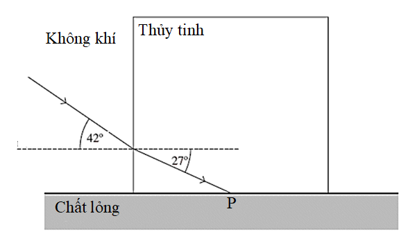 Một khối thủy tinh được giữ trên bề mặt một chất lỏng chiết suất n. Tia sáng từ không khí tới bề mặt thủy tinh với góc tới 420, góc khúc xạ trong thủy tinh là 270 thì bắt đầu xảy ra hiện tượng phản xạ toàn phần tại bề mặt tiếp xúc giữa thủy tinh và chất lỏng (hình vẽ). Tính chiết suất của chất lỏng.